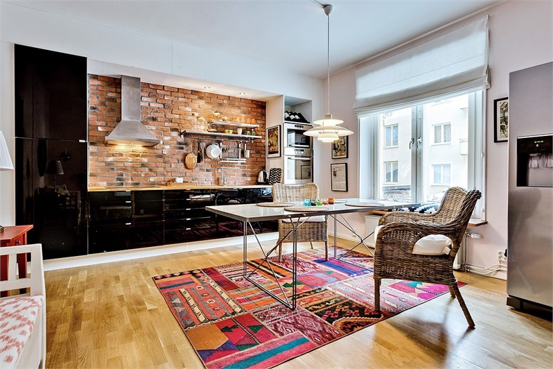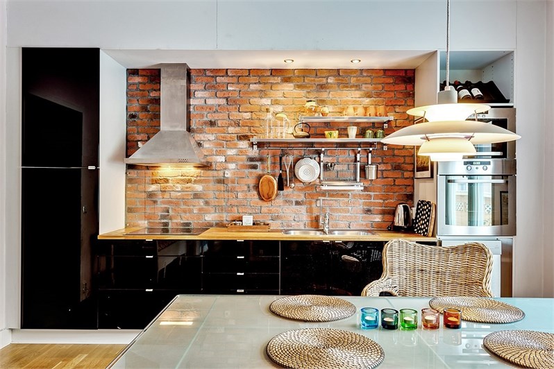 Repare nos armários de cozinha, em preto piano como combinam na perfeição com a parede em tijolo.