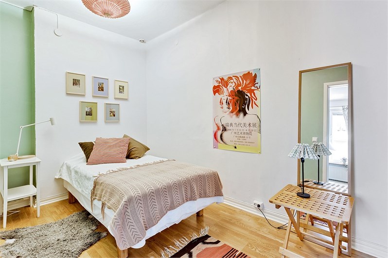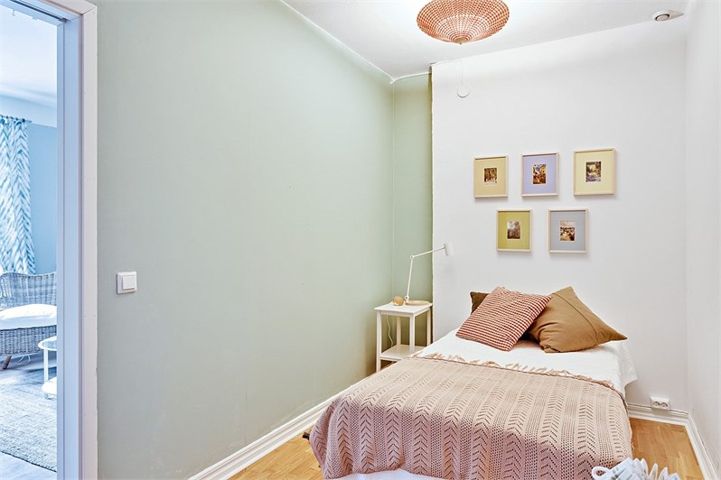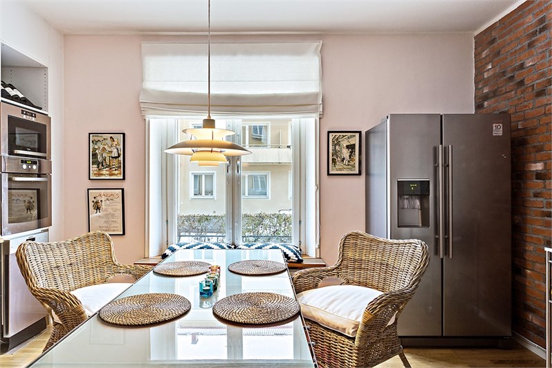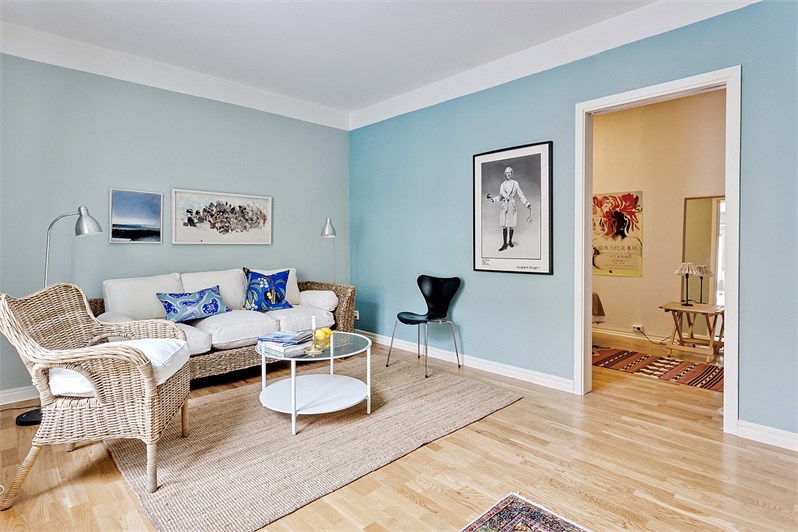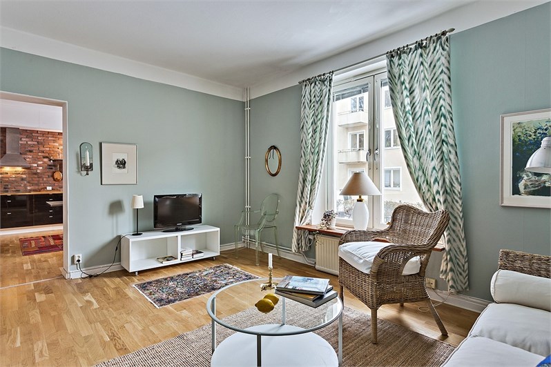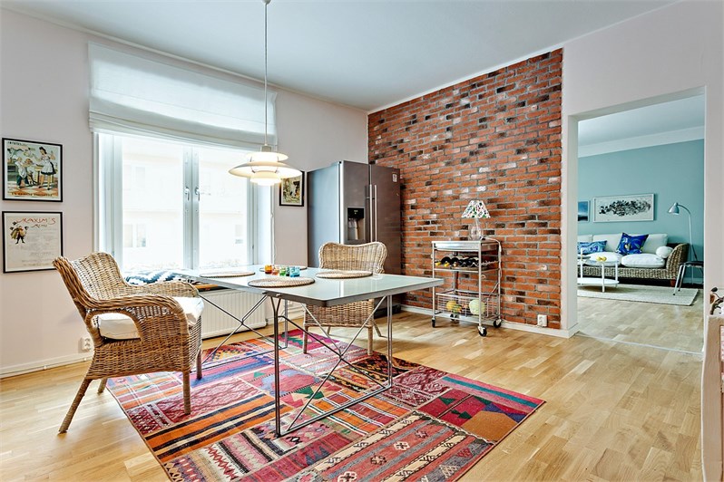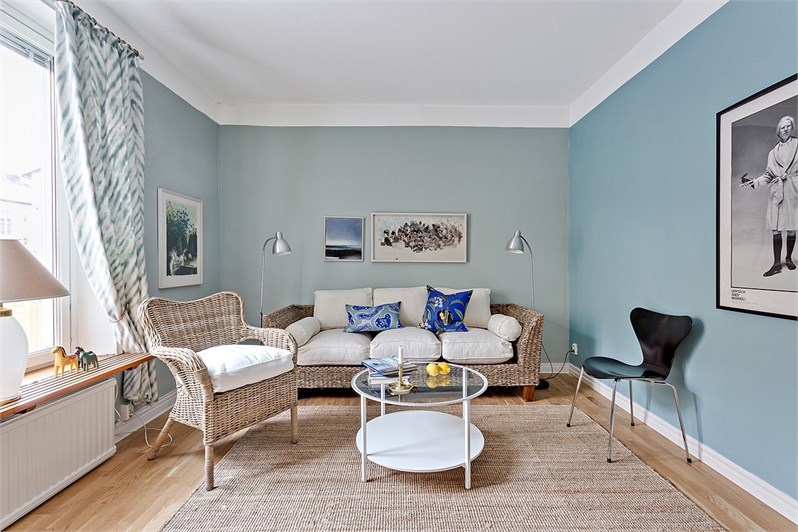 Tapete, tijolos, azul na sala de estar, aqui está uma decoração sueca de um apartamento que não é nada comum e neutro. O rattan leve combina com as cores escolhidas em todo o lado, o que o faz encantador.