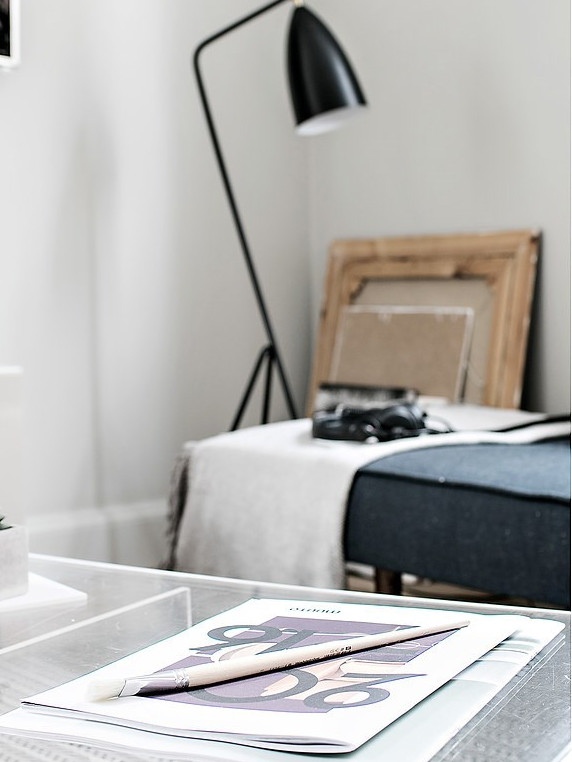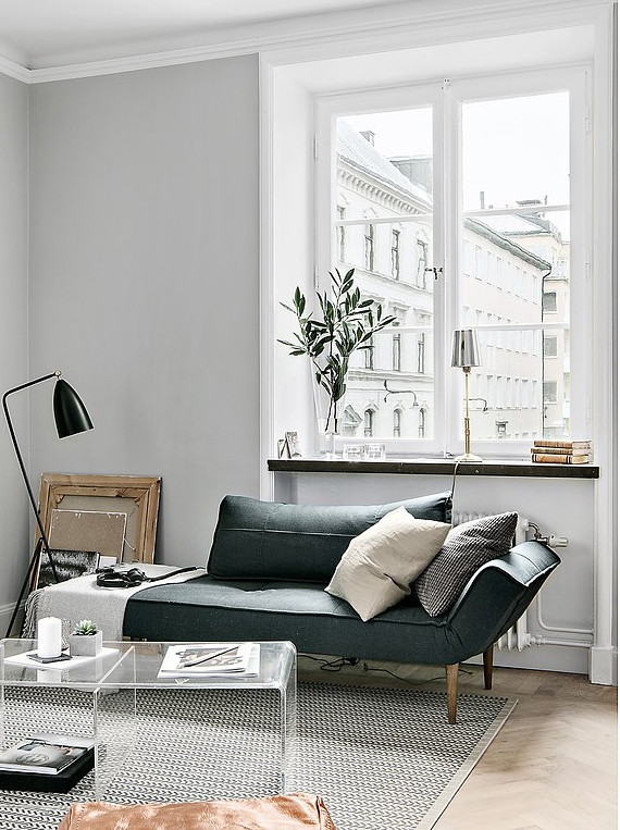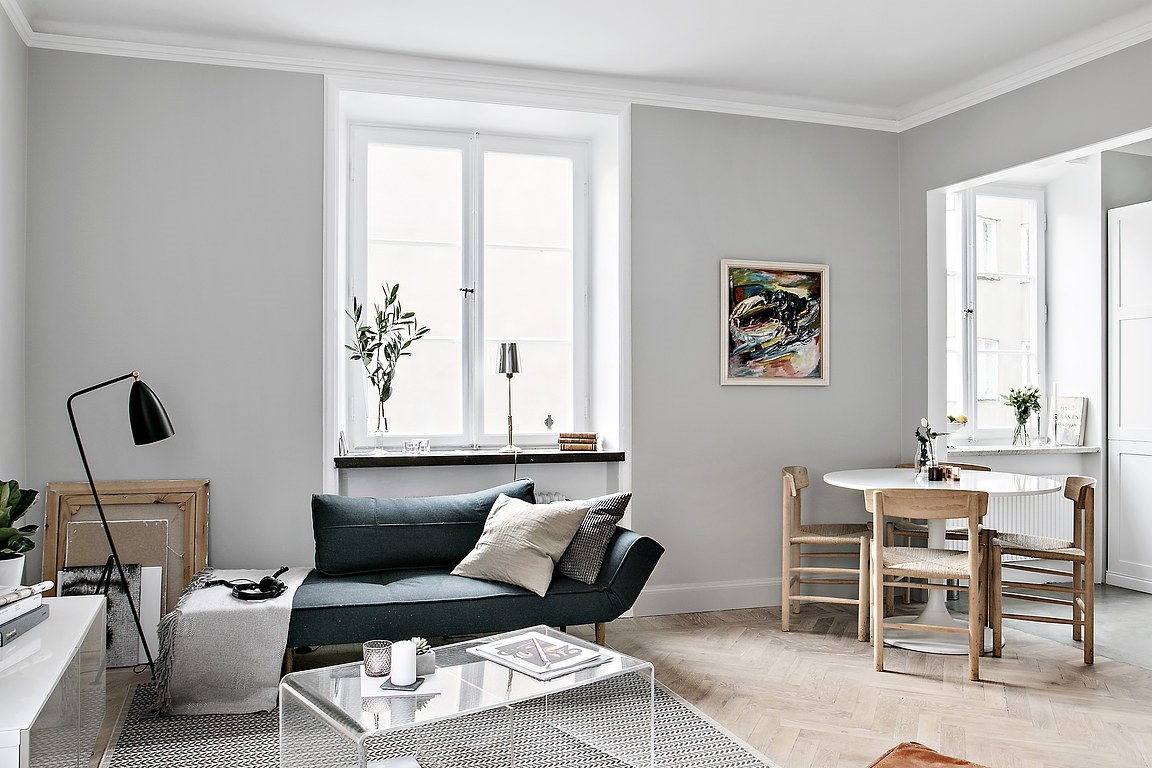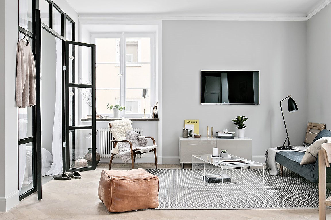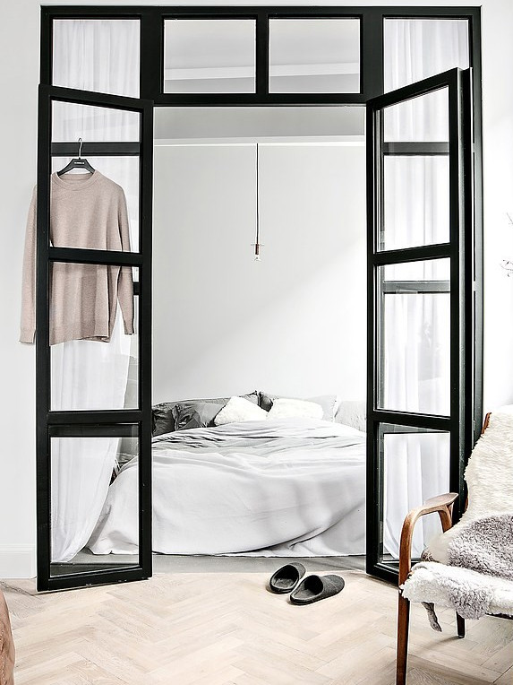 48m² de puro charme. Este apartamento tem vários recursos interessantes: um quarto atrás de uma parede de vidros, decoração de design quase minimalista na sala de estar e uma entrada como mechas escuras que nos leva para a luz.