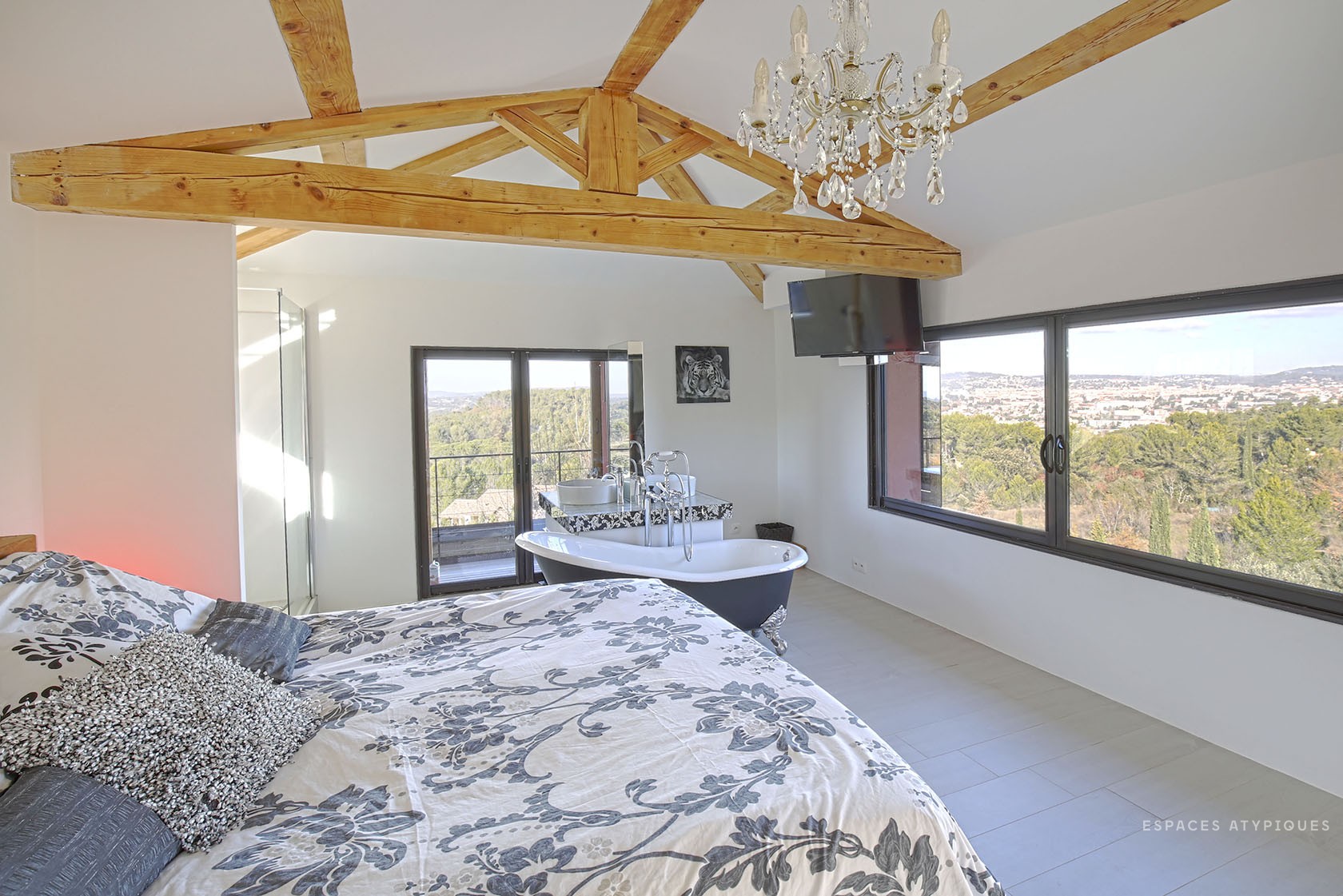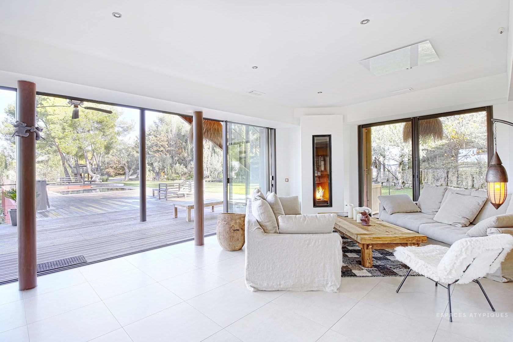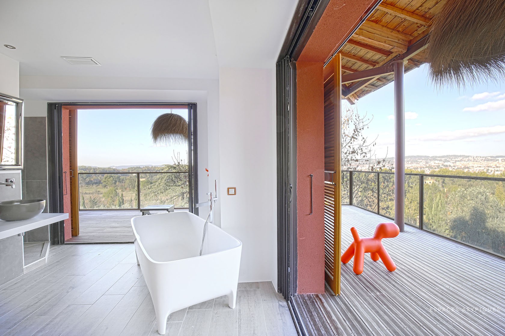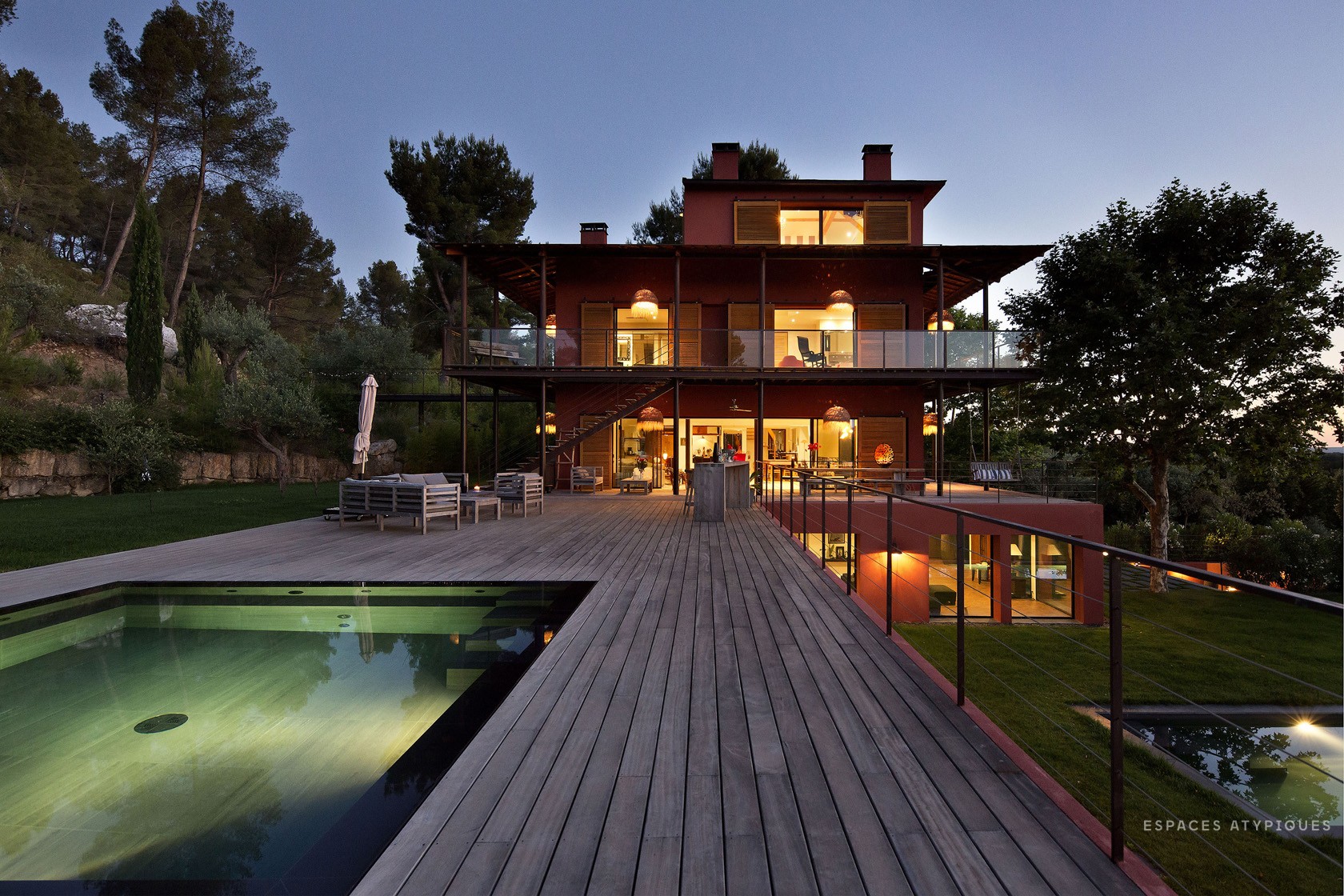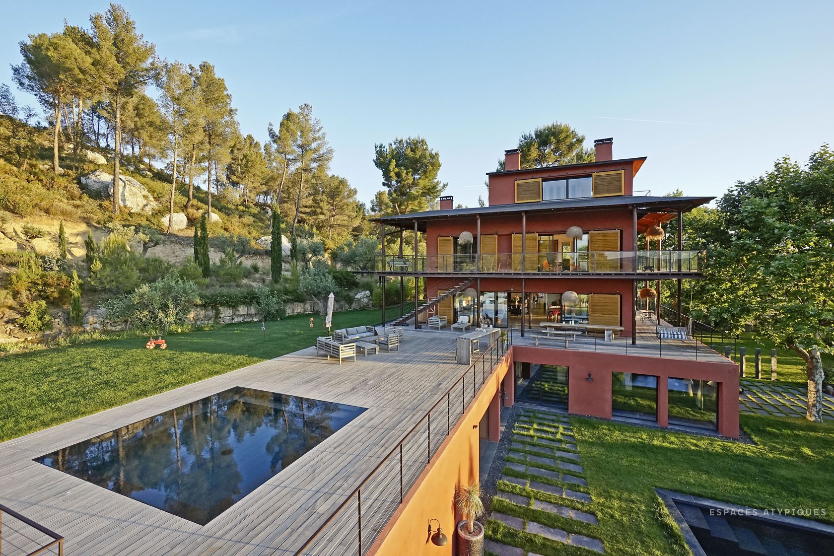 É o gabinete de arquitetura Espaces Atypiques que apresenta esta casa de estilo neo-colonial, situada em Aix-en-Provence, uma cidade onde a vida é um sonho. Com uma forma especial, este imponente edifício de 600 metros quadrados, embora próximo ao centro, tem um enorme jardim e 3 piscinas. Quase um hote...!