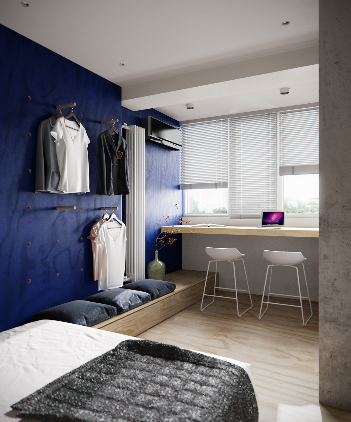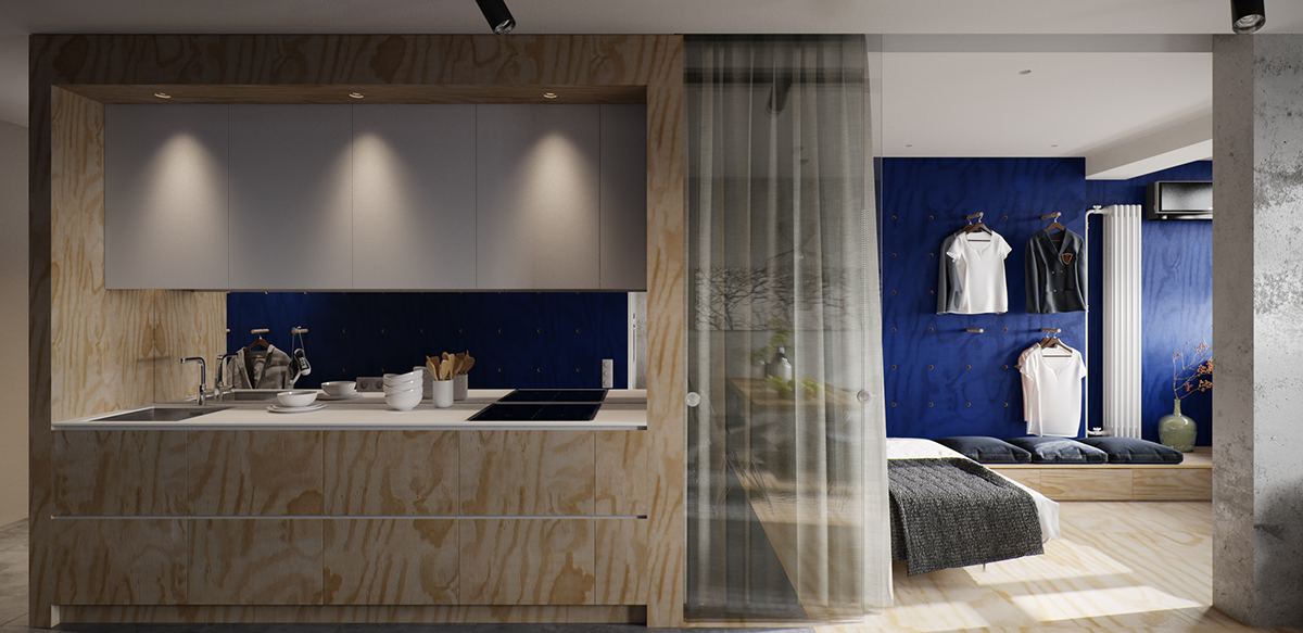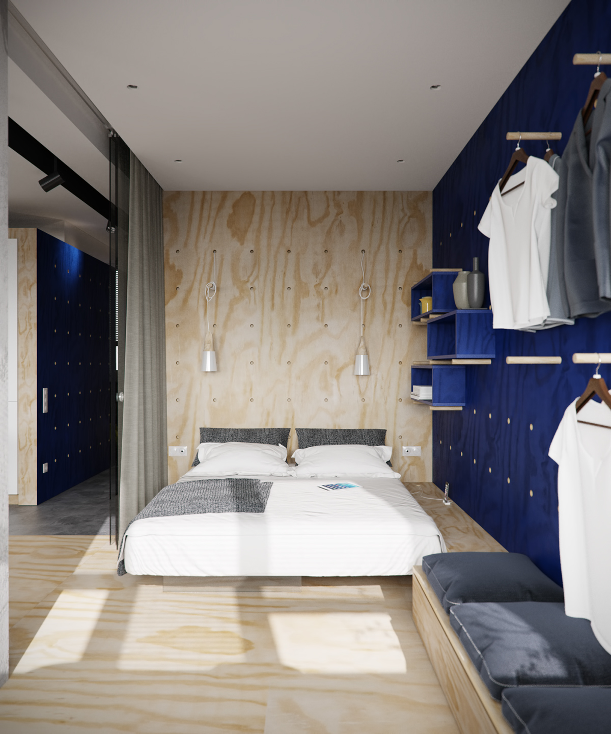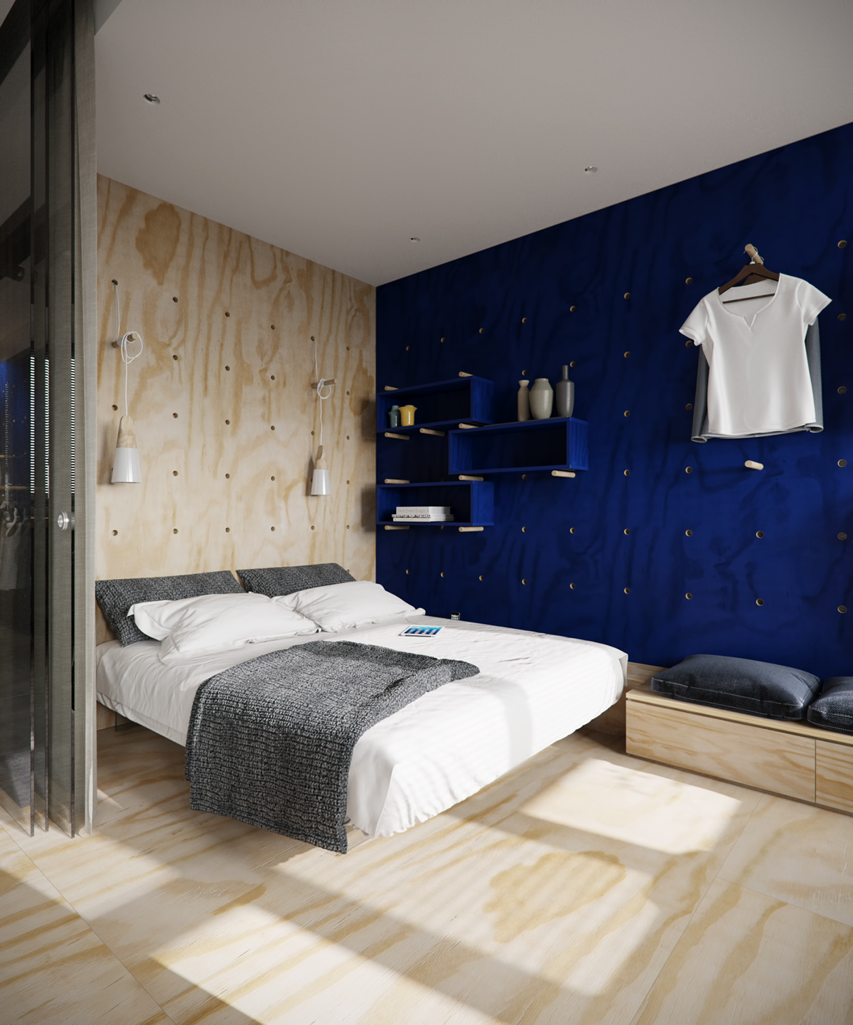 Perfeitamente adaptado para uma vida a dois, ele alterna cimento, madeira prensada, cores naturais e azul profundo num equilíbrio perfeito.
